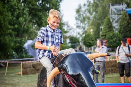 MINSK, BELARUS - MAY 1, 2017: A child enjoys the adrenaline rush while securely strapped a mechanical bull amusement ride