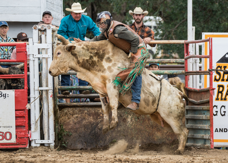MERRITT B.C. CANADA May 30 2015: Bull rider riding in the first round of The 3nd Annual Ty Pozzobon Invitational PBR Event.