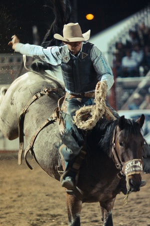 Cowboy riding a bucking bronc at a country rodeo Australia