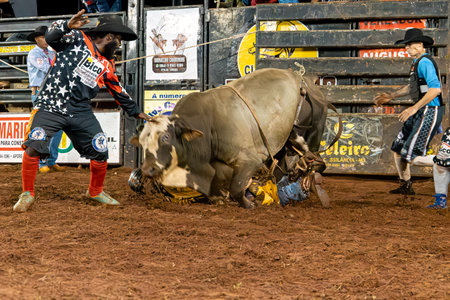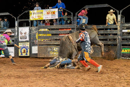 Itaja, Goias, Brazil - 04 21 2023: bull jumping on top of bull riding accident competitor