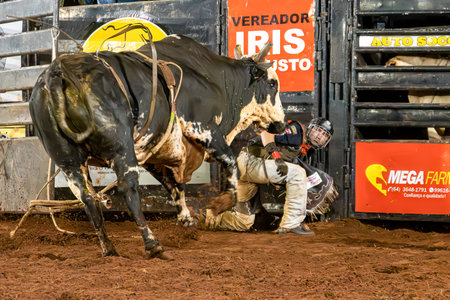 Itaja, Goias, Brazil - 04 21 2023: cowboy man riding a bull practicing bull riding at a rodeo