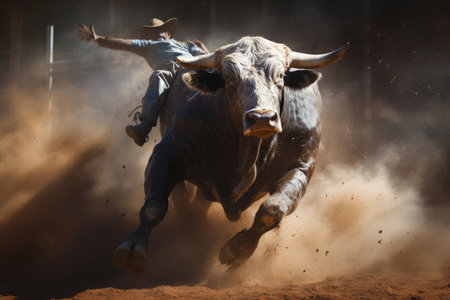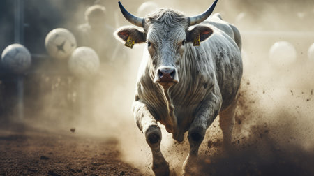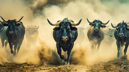 A bull is running through a cloud of dust. Concept of power and strength, as the bull charges through the dirt. The dust and dirt in the air give the scene a sense of chaos and movement