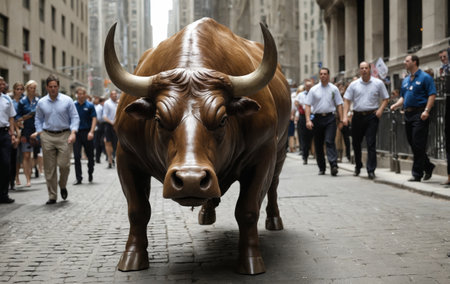 New York City, USA - November 6, 2018: The sculpture of Charging Bull by Arturo Di Modica in the Financial district in New York City, as captured on November 6, 2018.