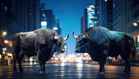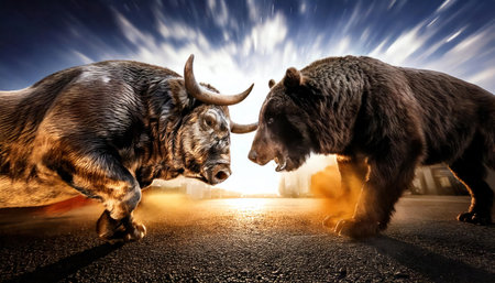Furious bear and angry bull face off symbolizing stock market conflict and financial tensions