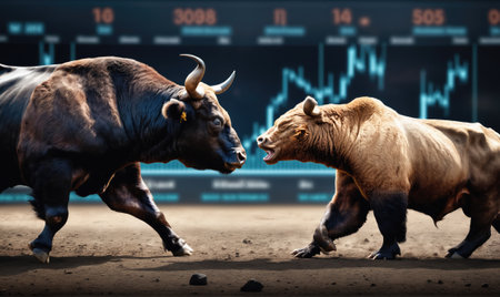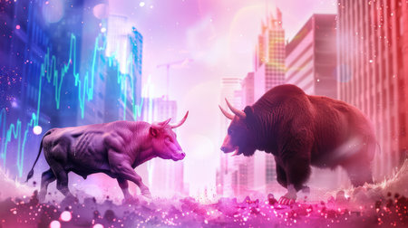 Bull vs bear clash energy power struggle over market direction, bold stock chart background volatility and economic tension visual