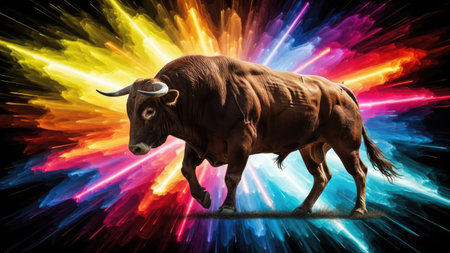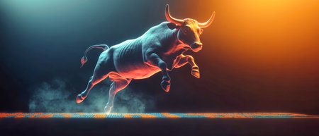 The bull soars over a vibrant stock market chart, illuminated by striking blue and orange lights in an immersive dark setting.