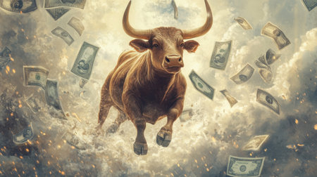Bull exuding wealth and power with floating money in a surreal backdrop of clouds and light, symbolizing financial gains