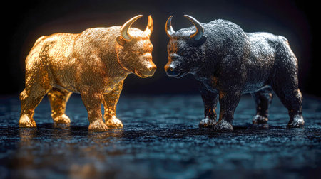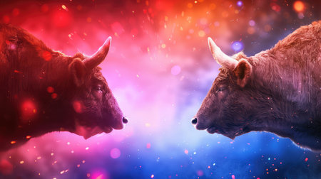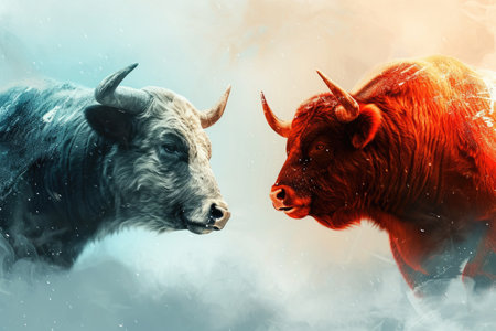 Two bulls stand facing each other in a snowy landscape, An artistic representation of a bull and bear market, AI Generated