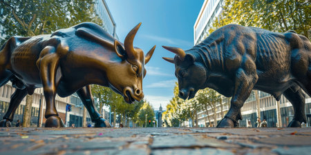 Two bull statues are facing each other on a sidewalk. The statues are made of bronze and are positioned in front of a building. The scene gives off a sense of conflict and tension