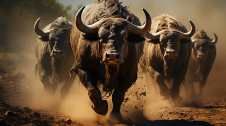 A mighty bull charges through the desert, kicking up a dust cloud. A powerful image of raw nature.