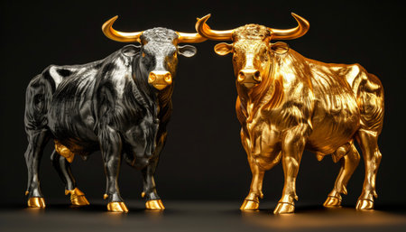 A close-up of two metallic bulls standing on a surface with cryptocurrency symbols, representing bullish trends in the financial market and cryptocurrency industry.