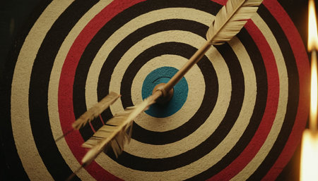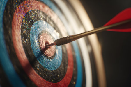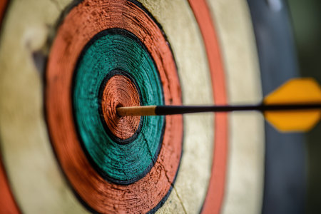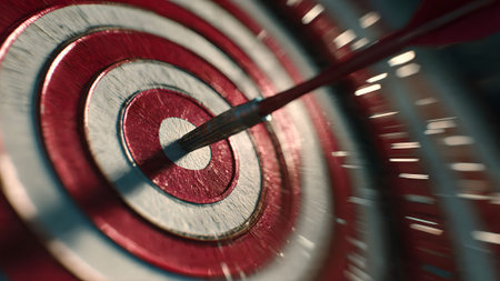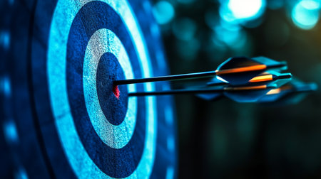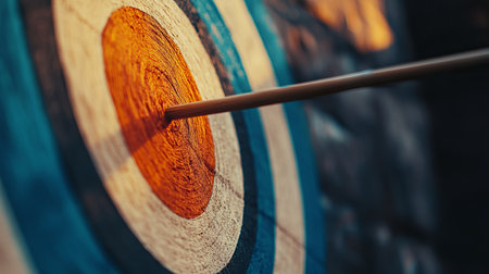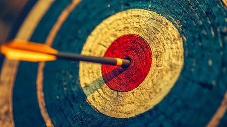 Close-up of an arrow hitting the bullseye of a target, symbolizing focus, accuracy, and achieving goals.