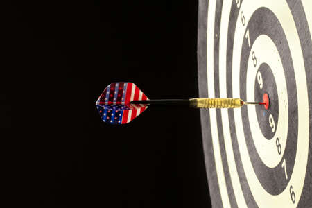 Dart hitting the bullseye on a dartboard. Business target or goal success and winner concept