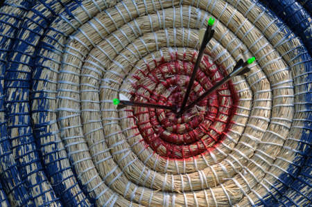 Arrow is hitting the center of an old target on a target range