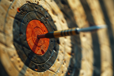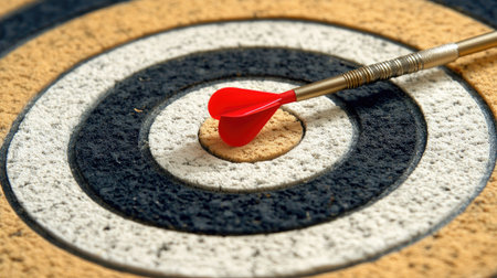 A close-up shot of a dart stuck perfectly in the bullseye of a dartboard, symbolizing precision, accuracy, and successful target achievement. AI generation