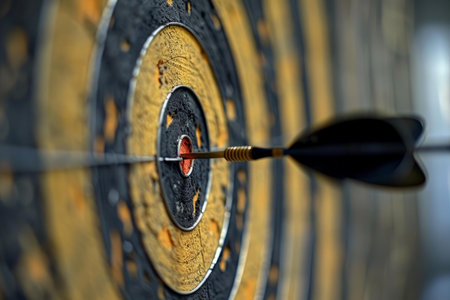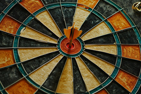 Close-up image of a dartboard with a dart hitting the bullseye. Concept of accuracy, precision, goal achievement, target focus.