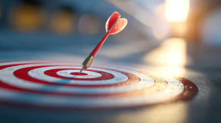 A close-up captures a dart precisely lodged in the bullseye of a target. The dart features a red fletching against a backdrop of concentric circles. The lighting suggests an indoor setting, possibly with overhead illumination. Suitable for visualizing success and goal achievement.