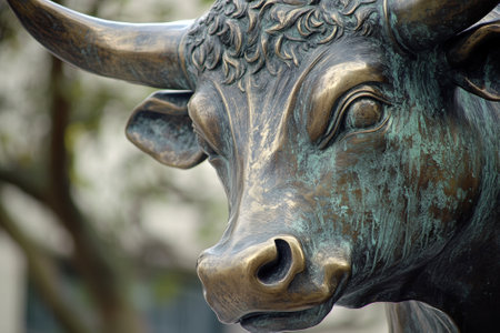 imagine a striking art piece showcasing a magnificent metallic bull, gleaming under the high noon sun, positioned proudly amidst a sea of vibrant green upward trending arrows