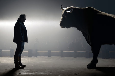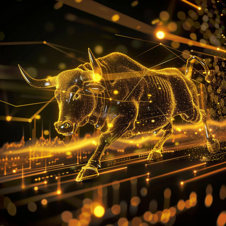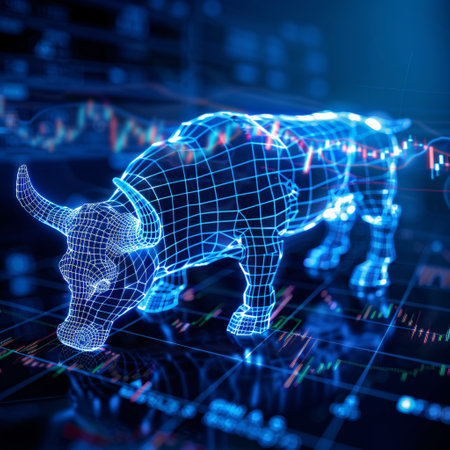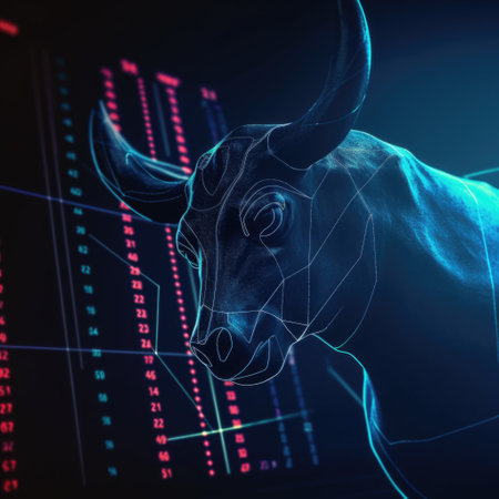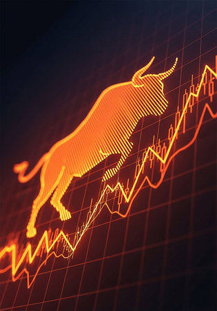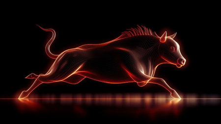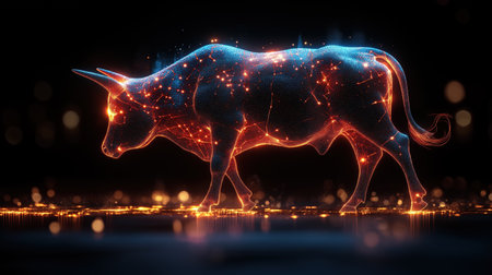 A striking bull illustration made of glowing lines represents strength in finance against a dark stock market backdrop.