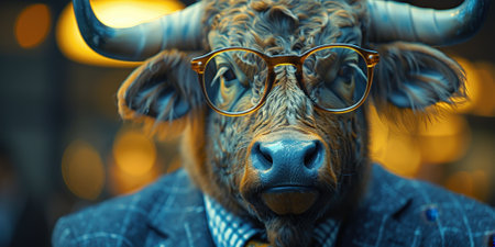 A stylish bull wearing a suit and sunglasses, exuding confidence and sophistication, set against an urban background.