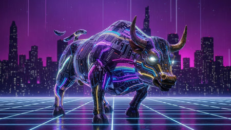 A digital illustration showcases a bull constructed with circuit board patterns, illuminated by vibrant neon lights. The artwork features a futuristic city skyline backdrop with a grid floor, employing a cool color palette. This image could be suitable for various commercial applications, including marketing, technology, and financial concepts.