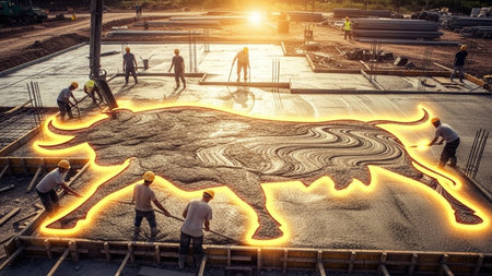 Pouring concrete at a construction site. Workers are pouring concrete on a construction site.
