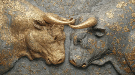 This artwork features two bull heads facing each other, elaborately crafted in relief. The use of gold detailing against a textured gray background creates a striking visual contrast.