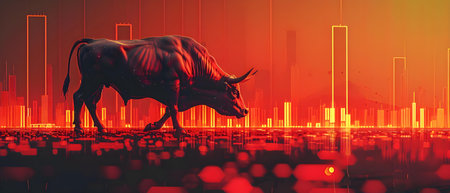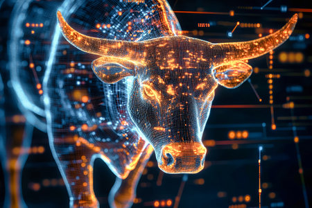 A powerful bull symbolizing strong market trends and investment potential. The digital backdrop emphasizes growth and technology in today
