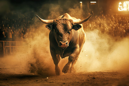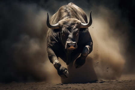 A powerful bull running through the dirt. This image can be used to represent strength, power, and determination. Ideal for sports, nature, and advertising projects.