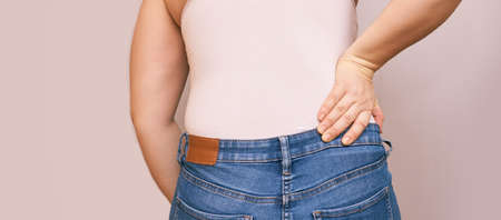 Woman lower back pain. Hold hand near body. Self chiropractic massage. jeans and top shirt. Sport muscle nerve displacement