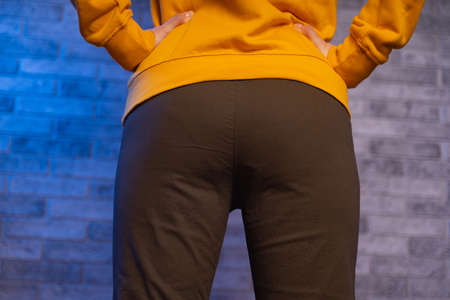 Rear view on back body part of young female against a brick wall. Close up of unrecognizable woman moving buttocks