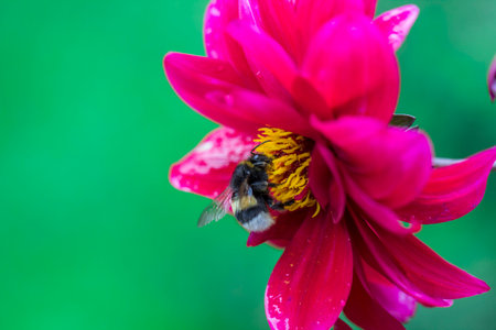 Wet bumblebee (Bombus) on the blossom of a garden flower in a bee meadow.