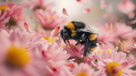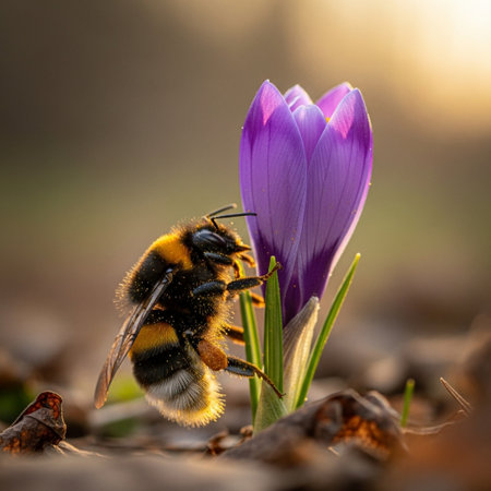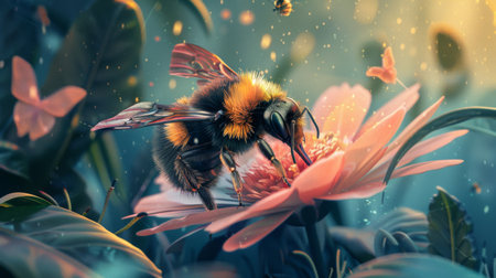 A bumblebee busily gathers nectar from a colorful flower in a serene garden, illuminated by warm sunlight, showing the beauty of spring.