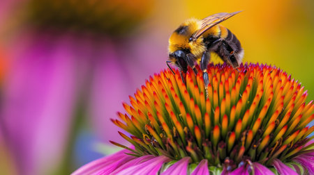 A macro shot of a bee on a purple coneflower, deeply engaged in nectar collection, with the flower