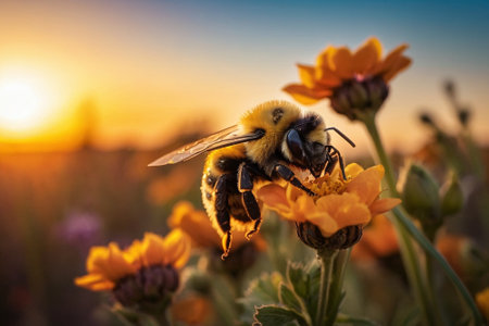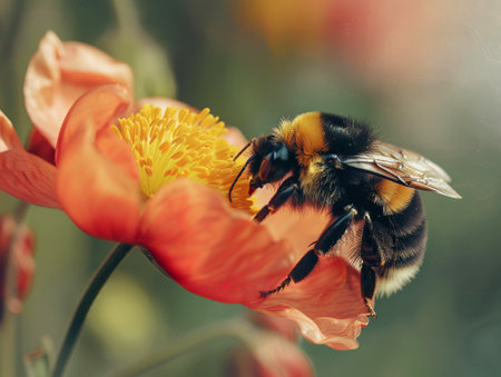 A bumblebee with black and yellow stripes, sitting on an orange flower. The background is blurred to focus attention on the bee. --v 6.1 Job ID: ff00e2ec-39f2-422a-acdc-37ab9e73cc0c