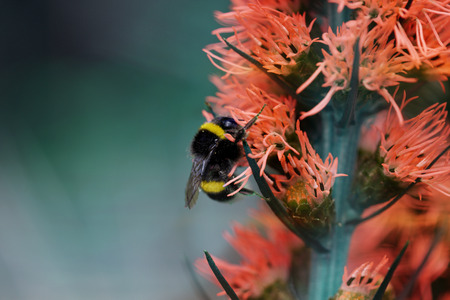 Macro photo bumblebee on an orange flower. Bumblebee collects nectar on the flower.