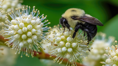 A stunning close-up image of a bumblebee collecting nectar from delicate white flowers in a lush garden, showcasing the intricate details of nature and pollination.