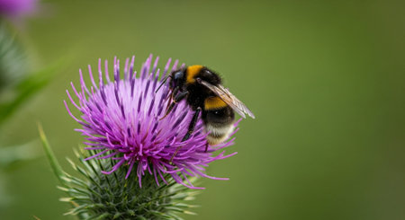 A stunning macro photograph capturing a bumblebee gathering pollen from a lovely purple flower, illustrating the essential role of pollinators in maintaining biodiversity and ecological balance.