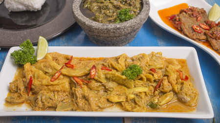 Fried cow lung and shredded coconut with spicy onion chilli sauce and vegetables, traditional food from East Java, Indonesia.
