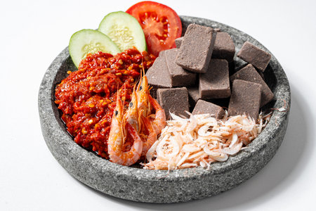 sambal or traditional chili sauce from Indonesia, freshly made using a stone mortar and pestle with fried tempeh and cucumber