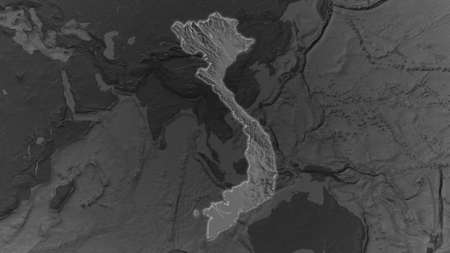 Vietnam area enlarged and glowed on a darkened background of its surroundings. Bilevel bumped elevation map
