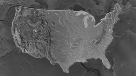United States Mainland area enlarged and glowed on a darkened background of its surroundings. Grayscale bumped elevation map