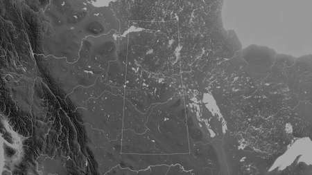 Saskatchewan, province of Canada. Grayscaled map with lakes and rivers. Shape outlined against its country area. 3D rendering