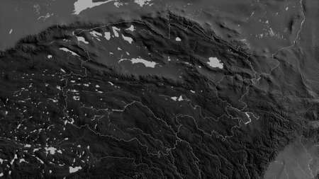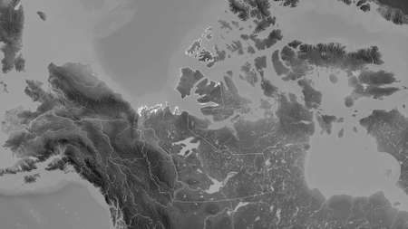 Northwest Territories, territory of Canada. Grayscaled map with lakes and rivers. Shape outlined against its country area. 3D rendering