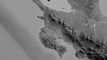 Guanacaste, province of Costa Rica. Grayscaled map with lakes and rivers. Shape outlined against its country area. 3D rendering