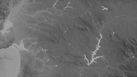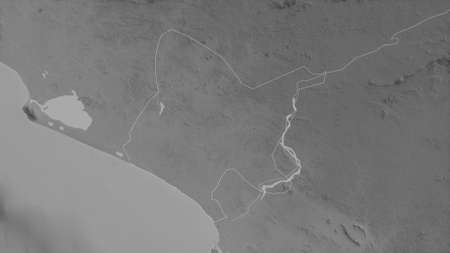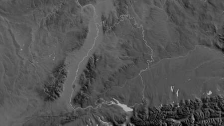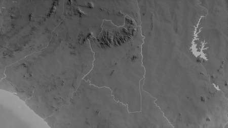 Bouenza, region of Republic of Congo. Grayscaled map with lakes and rivers. Shape outlined against its country area. 3D rendering