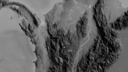 Shan, state of Myanmar. Grayscale elevation map with lakes and rivers