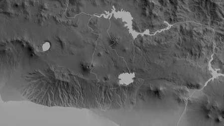 Ombella-M'Poko, prefecture of Central African Republic. Grayscaled map with lakes and rivers. Shape outlined against its country area. 3D rendering