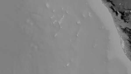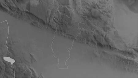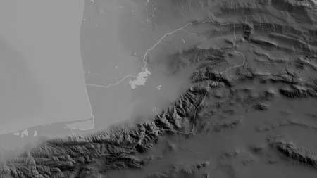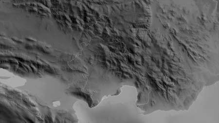 Azua, province of Dominican Republic. Grayscaled map with lakes and rivers. Shape outlined against its country area. 3D rendering