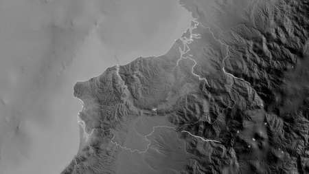 Esmeraldas, province of Ecuador. Grayscaled map with lakes and rivers. Shape outlined against its country area. 3D rendering